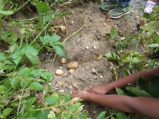 練習が終わった後、お昼ご飯までの間に、みんなで植えたジャガイモの収穫をしました。