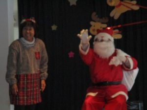 サンタさんが大きな袋にプレゼントを入れて登場!!!会場からどっと歓声があがりました。(一部鳴き声も…)