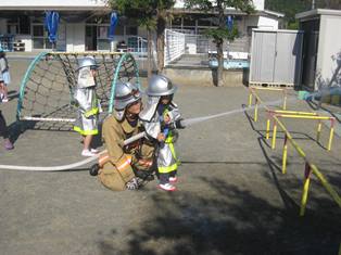 年長組の特典!なんと消防服に着替えて放水活動を体験させてもらいました。