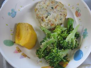 ↑ 卵を使っていないハンバーグ。豆腐と豚ひき肉、たくさんのお野菜を入れた