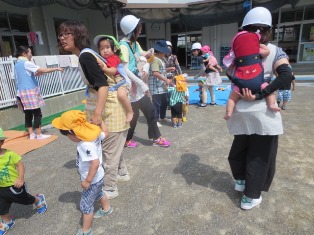 いちご・りんご組のお友達は、職員が背負います。