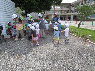 非常ベルが鳴り、一斉に園庭に出て避難体制をとります。
