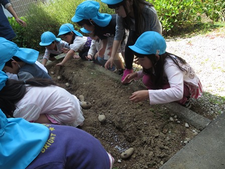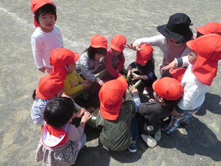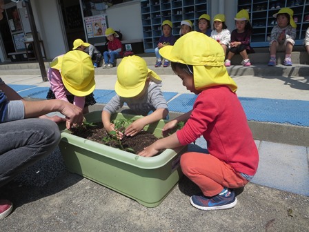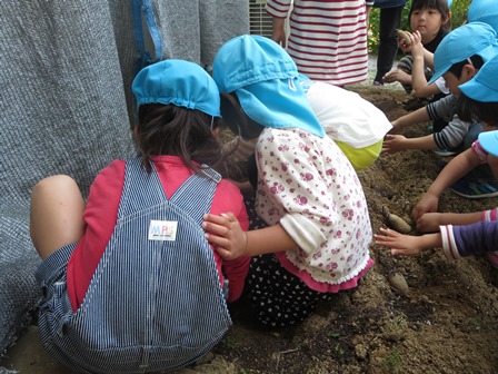 続いてぶどう組さんは、保育園の裏の畑でジャガイモ「メークイン」を植えました。