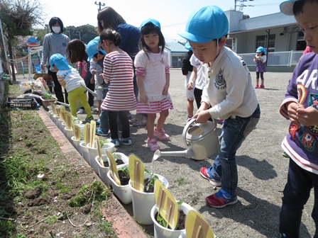 年長ぶどう組さんは、一人ずつ鉢をもらって自分だけの「凜々子」を育てます。