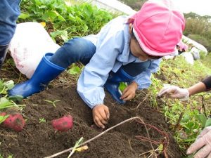土から顔を出したお芋に必死で食らいつくお友達。