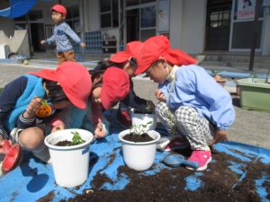 土を何度も入れては「これでいい??」と聞いているお友達や、