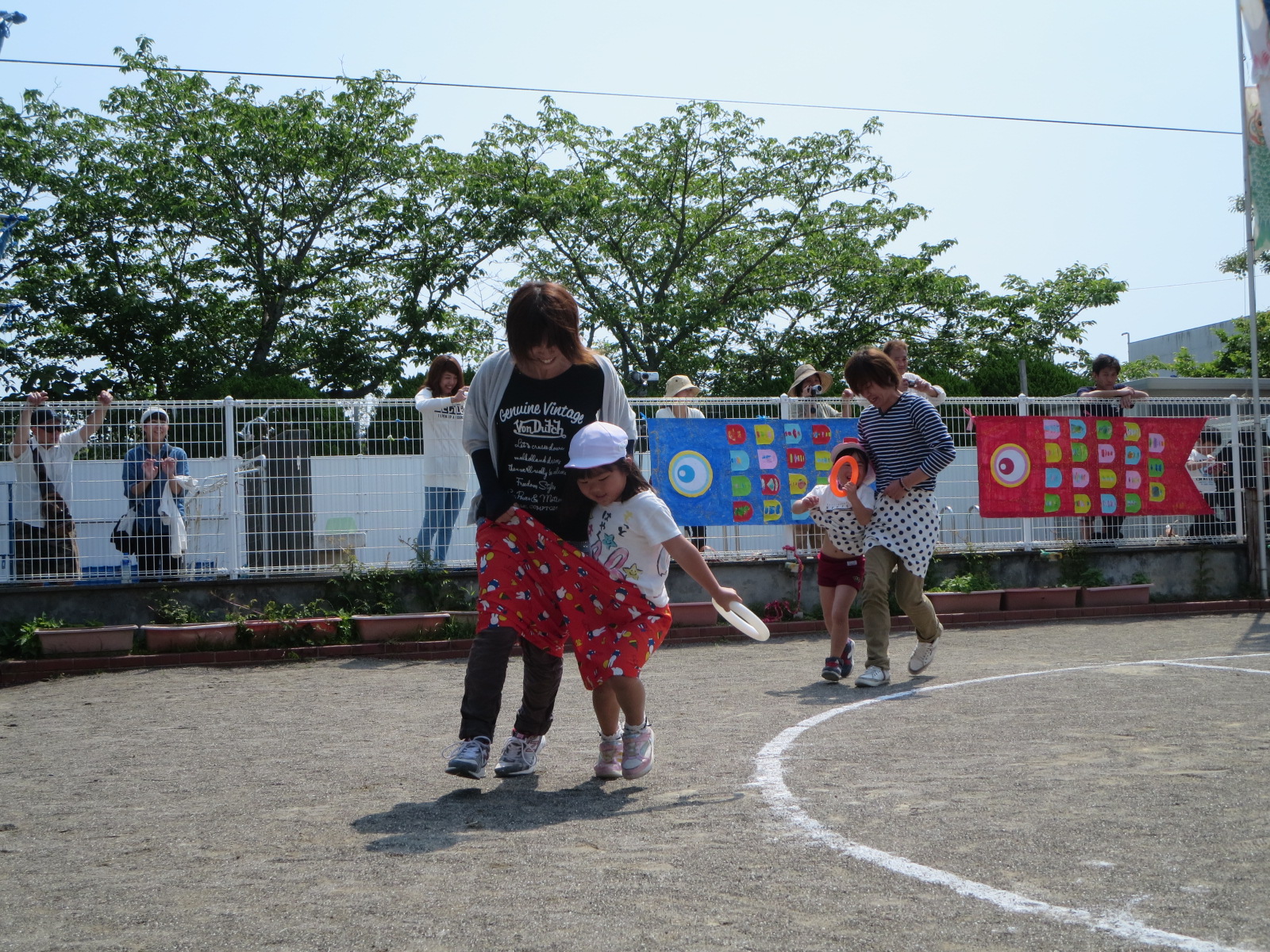 親子で息を合わせてトラックを一周します。これがなかなかハードです。でもやるほうも見るほうも楽しかったね‼️