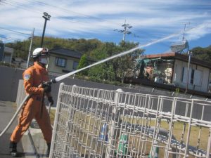 駐車場で、職員が消火訓練を行いました。