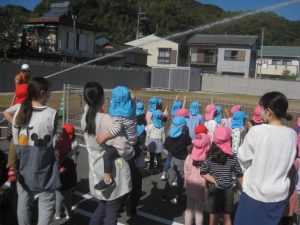 2歳児ばなな組さんは消防隊員になって火事を消しに出動します。
