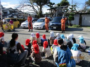 施設火災の訓練でした。近くの聖神社へ迅速に避難します。